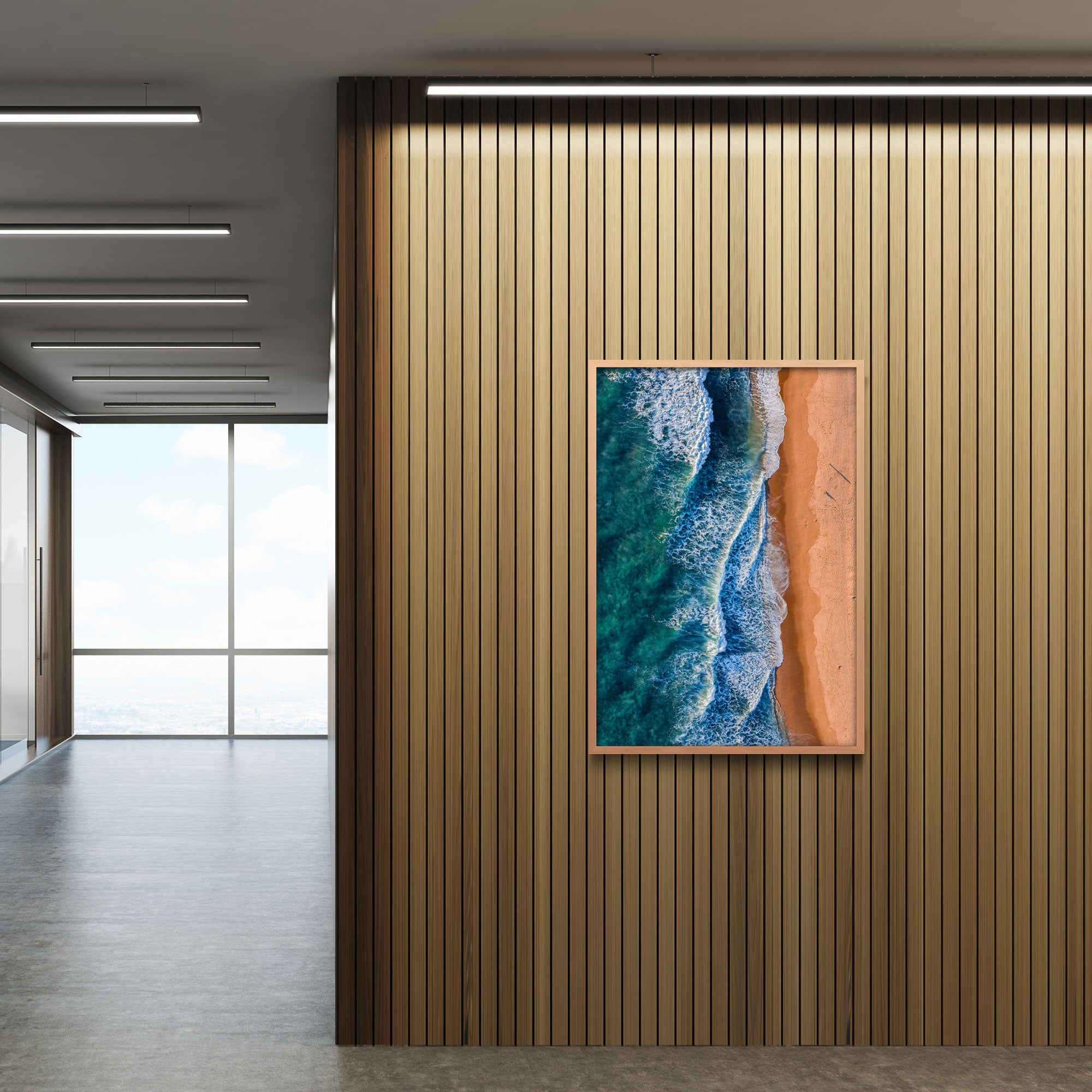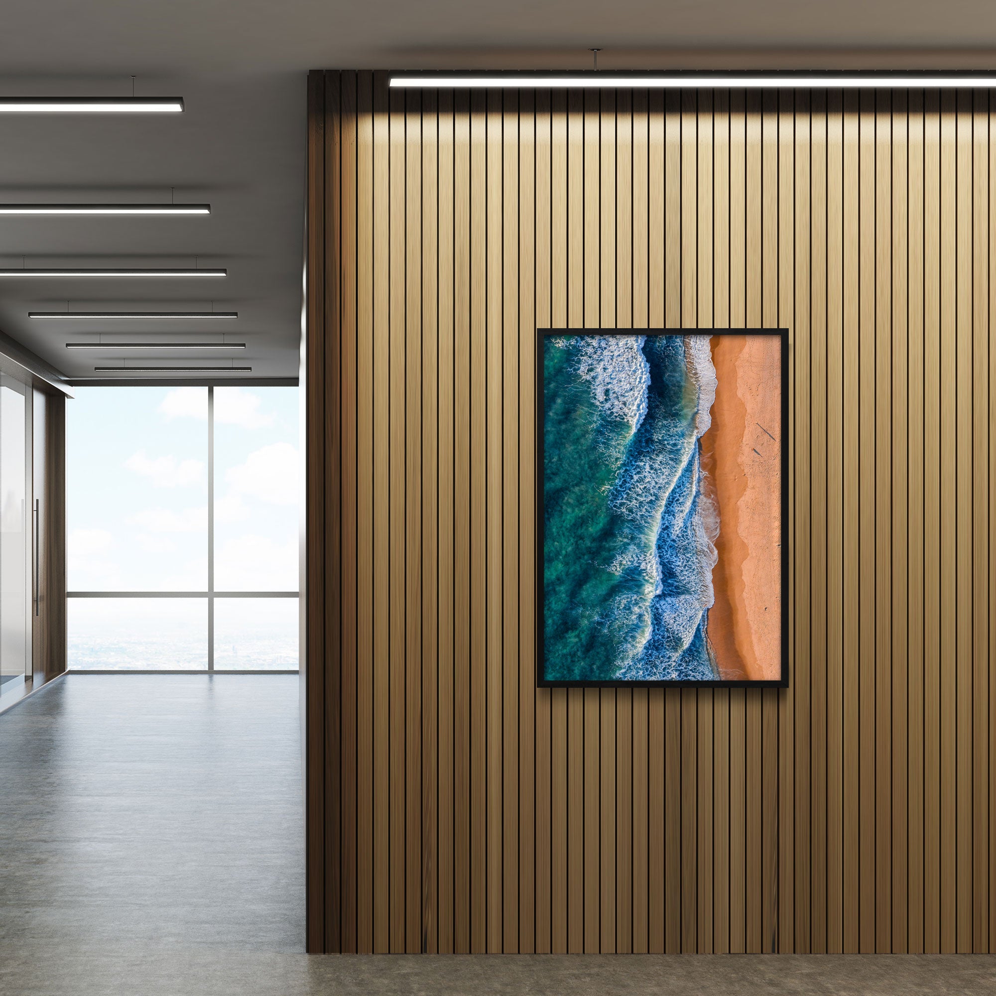 A sweeping Pacific-coast beach at Todos Santos unfolds under a wide sky, where soft white sand meets foaming waves of deep blue. The shoreline curves gently, framed by rugged coastal cliffs and swaying palms — a raw, tranquil slice of Mexico’s western edge. The sea whispers against the sand, surfers ride the swell, and in the distance the horizon blurs into a timeless blend of water and sky: wild, serene and endlessly inviting.