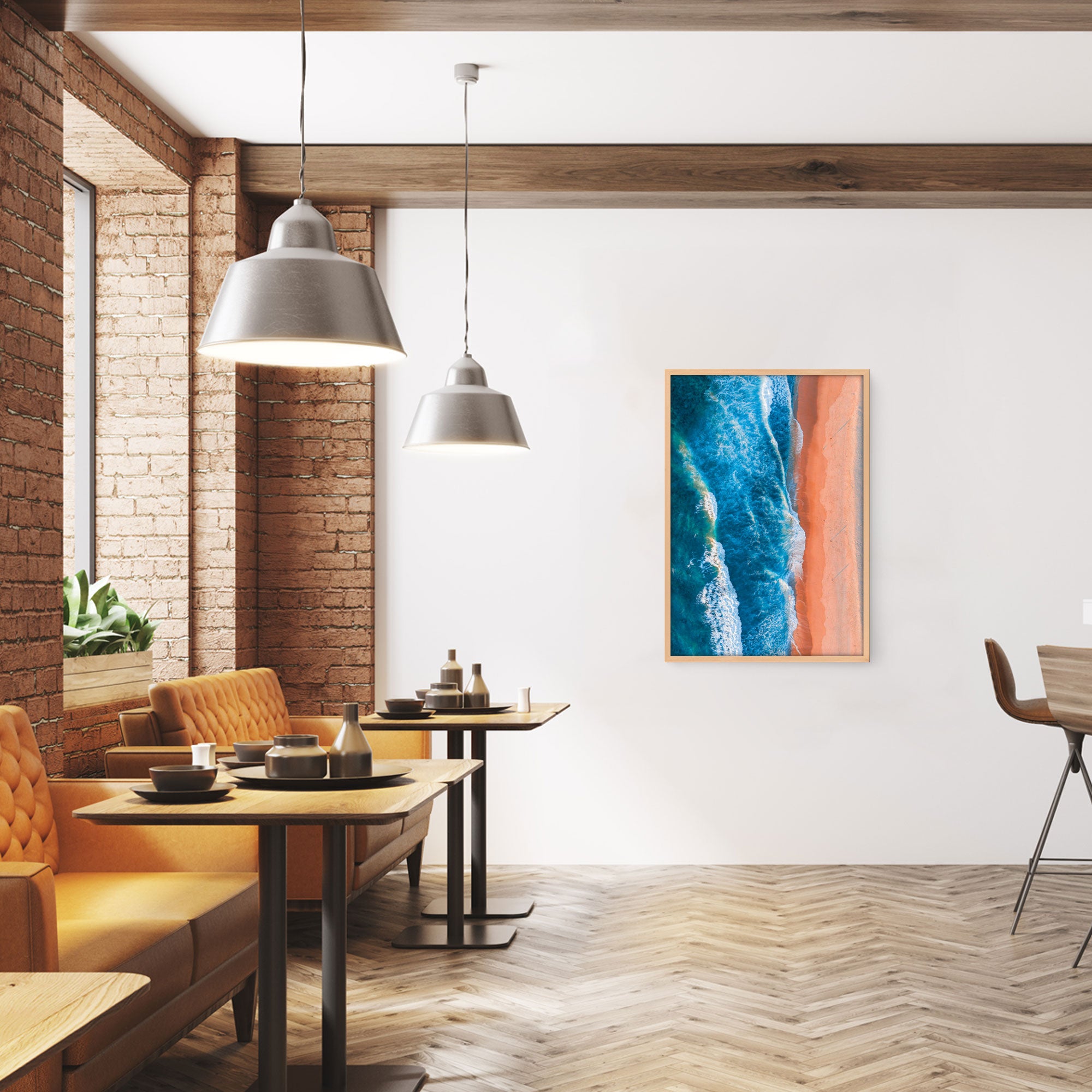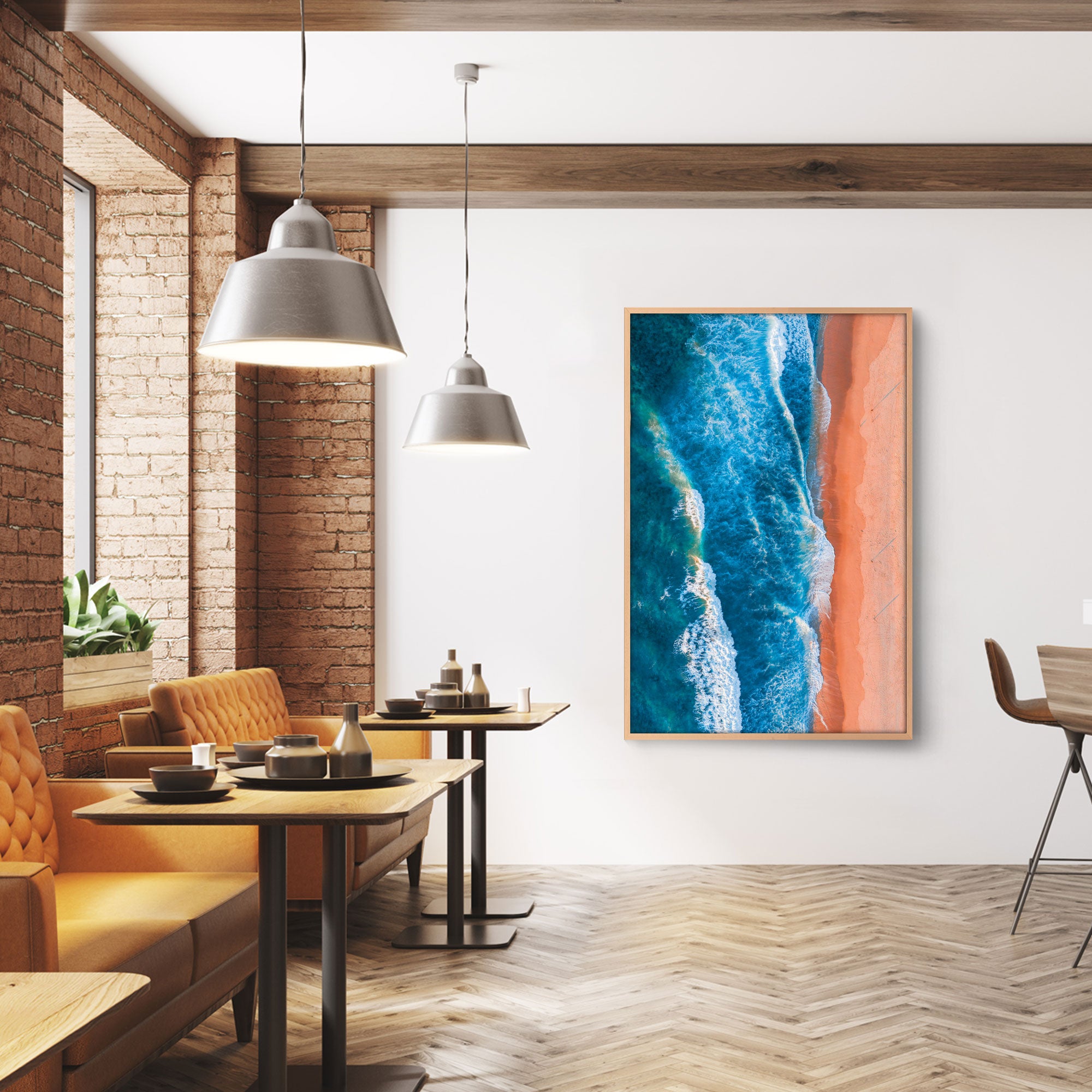 A wide Pacific-coast beach at Todos Santos stretches under an open sky, where soft beige sand meets rolling surf and deep blue waters. Rugged cliffs and gentle coastal hills frame the shoreline, while swaying palms and desert-oasis vegetation hint at the region’s unique blend of arid landscape and ocean breeze. The scene evokes a wild serenity — waves crash onshore, seabirds glide overhead, and the horizon merges sea and sky, inviting both calm reflection and adventurous exploration in a place where nature feels vast, raw and timeless.